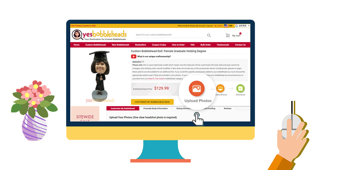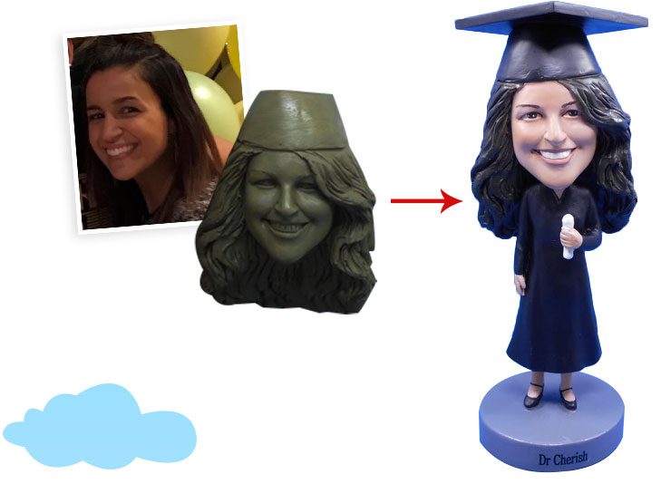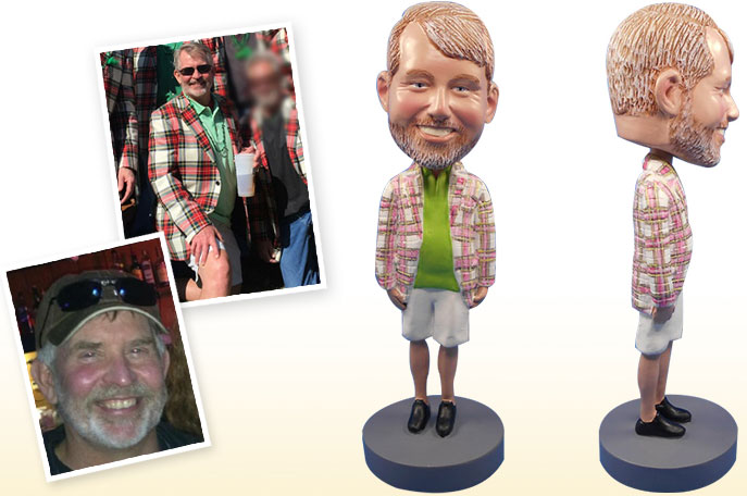 Upload your photos of the head and the body, also comment to describe the desired clothing style and body pose when you place the order. Our artists will then sculpt your custom bobblehead fully according to your requirements. You can also send your photos by email to: service@yesbobbleheads.com once you've placed your order.